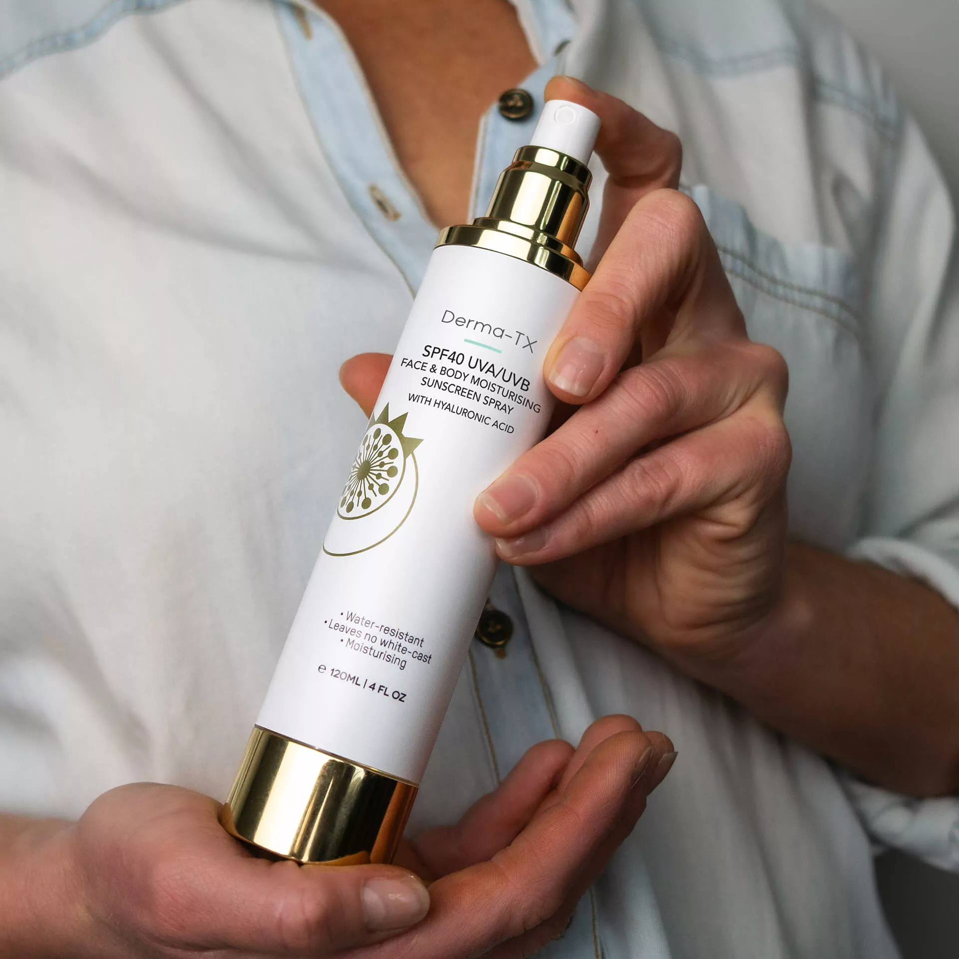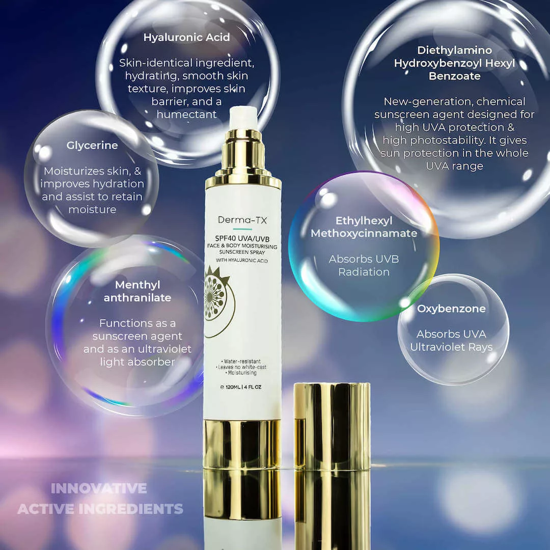 The Derma-TX SPF40 UVA/UVB Mist Spray is designed to provide high-performance sun protection in a lightweight, quick-drying format. This alcohol-based mist delivers broad-spectrum defense against harmful UVA and UVB rays, helping to prevent sunburn, premature aging, and environmental stress. The ultra-fine spray absorbs instantly, leaving no white-cast or greasy residue—just a clean, invisible finish that feels refreshing on the skin. Hyaluronic Acid ensures skin stays hydrated and supple, even in intense sun exposure.